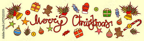© mast3r, Naklejka premium Merry Christmas Text Design On New Year Decorations Background Hand Drawn Style Horizontal Poster Vector Illustration