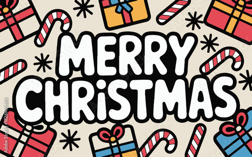 © Jacki, Fototapeta premium Merry christmas text with candy canes gifts and stars on a beige background holiday celebration
