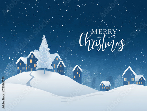 Naklejka premium Merry Christmas Winter Village Snowfall Greeting Card