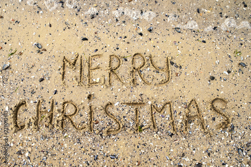Fototapeta premium Merry Christmas written on tropical beach sand, copy space. Holiday concept,...