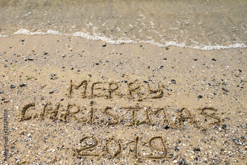 Fototapeta premium Merry Christmas written on tropical beach sand, copy space. Holiday concept,...