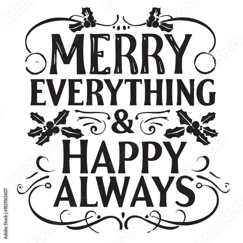 © Arpan, Fototapeta premium Merry Everything Happy Always text with holly berries and swirls christmas holiday