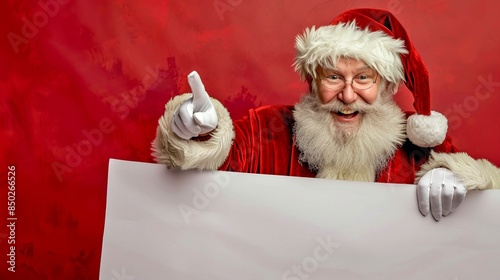 © Irina Ukrainets, Naklejka premium Merry Santa Claus holding a blank banner, festive Christmas theme. Santa is smiling warmly with his iconic red outfit and hat. Image is perfect for advertisements and holiday greetings. AI