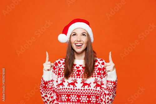 © ViDi Studio, Fototapeta premium Merry young woman wear red warm Christmas sweater Santa hat posing point index finger overhead indicate on area mock up isolated on plain orange background. Happy New Year celebration holiday concept.
