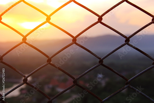 Fototapeta premium Mesh fence close-up on a blurred background of Beautiful scenery during time the sunset. The nature and the freedom concept