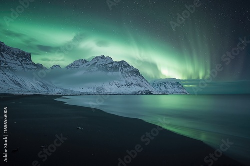Fototapeta premium Mesmerizing Aurora Lights Over Snow-Covered Peaks and Misty Shores