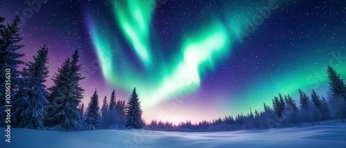 © Sweettymojidesign, Naklejka premium Mesmerizing auroras illuminate a snowy landscape under a starlit sky.