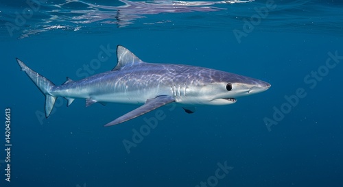 © meka, Naklejka premium Mesmerizing Blue Shark Swimming Gracefully Beneath Ocean Surface Waters