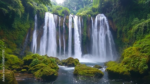 Obraz premium Mesmerizing Cascading Waterfall Surrounded by Lush Green Wilderness in...