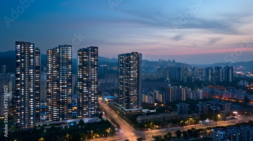 © pkproject, Fototapeta premium Mesmerizing Cityscape at Twilight with Glowing Skyscrapers and Illuminated Infrastructure