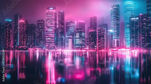 Obraz premium Mesmerizing Cityscape of Glowing Skyscrapers Reflecting in the Vibrant Night...