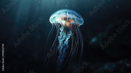 Fototapeta premium Mesmerizing close-up of a jellyfish drifting through the dark, lifeless ocean depths, with its elegant tentacles illuminated
