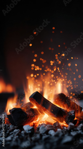 © Jirawatfoto, Fototapeta premium Mesmerizing close up of warm fire with burning wood log. hot flame and glowing ember create bright spark in dark night, feeling very cozy and relaxing