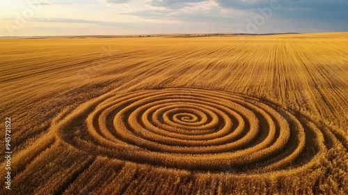© Ratchadaporn, Naklejka premium Mesmerizing Crop Circles in Vast Wheat Field Mysterious Natural Spiral Formation