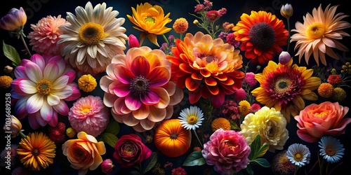 © Curie, Naklejka premium Mesmerizing double exposure artwork featuring blooming flowers on a dark background; vivid floral patterns come to life in a striking fusion of nature and artistic expression.