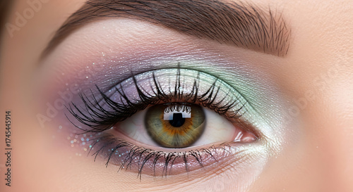 Obraz premium Mesmerizing eye with artistic pastel eyeshadow in shimmering purples and greens, paired with lush, dark eyelashes, emphasizing sophisticated beauty and cosmetic elegance for a captivating gaze