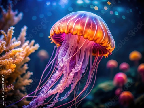 Naklejka premium Mesmerizing glowing jellyfish illuminate an underwater world, captured in...