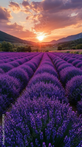 Fototapeta premium Mesmerizing Lavender Fields at Sunset in Serene Mountain Valley Landscape
