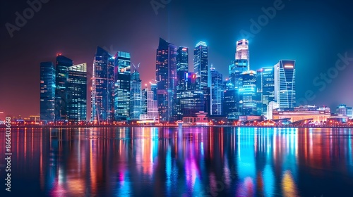 © Thares2020, Fototapeta premium Mesmerizing Nightscape of a Futuristic City Skyline with Illuminating Skyscrapers Reflected on Water