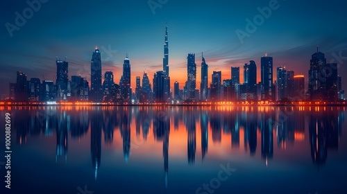Fototapeta premium Mesmerizing Nighttime Skyline of Illuminated Skyscrapers Reflecting in Dubai...
