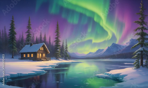 © A_A88, Fototapeta premium Mesmerizing northern lights over a snow-covered lake and a cozy forest cabin