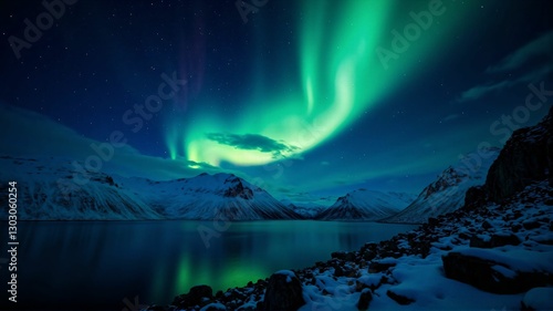 © Yuudaishin, Naklejka premium Mesmerizing Northern Lights Reflected Over a Frozen Arctic Lake – A Spectacular Natural Phenomenon Under the Night Sky