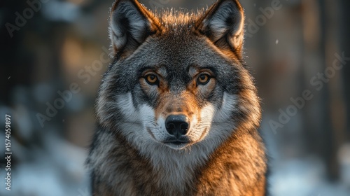 © luck, Fototapeta premium Mesmerizing portrait of a gray wolf with intense gaze in winter wilderness