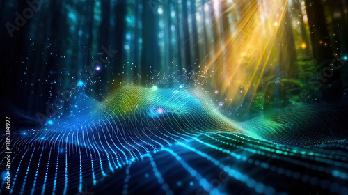 Fototapeta premium mesmerizing psychedelic landscape with vibrant colors and light beams illuminating digital wave pattern, creating surreal atmosphere