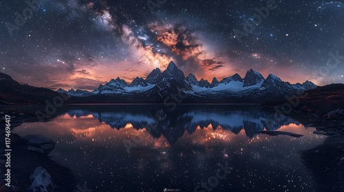 © Wuttichai, Naklejka premium Mesmerizing Starry Night Sky Reflected in a Tranquil Mountain Lake