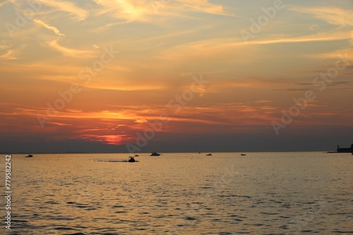 Fototapeta premium Mesmerizing sunset view over the sea with ships sailing in it in Zadar, Croatia