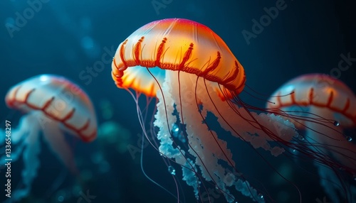 © Aumarin, Fototapeta premium Mesmerizing underwater scene featuring three vibrant jellyfish, their translucent bells glowing with orange and white hues, gracefully floating in a deep blue aquatic environment.