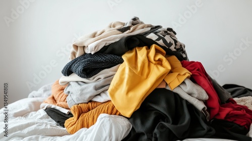 Fototapeta premium Messy pile of casually scattered clothes in various colors and fabrics, creating a chaotic and unorganized appearance. Concept of laundry, wardrobe clutter, and untidiness in daily life.