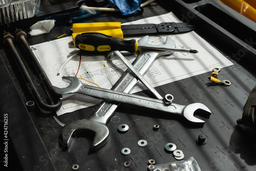© Juando González, Fototapeta premium Messy set of tools on a working table in a garage