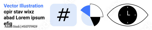 Obraz premium metadata tag icon, segmented pie chart, and an eye containing a clock. Ideal...