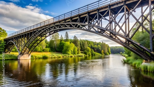 Obraz premium Metal Arch Bridge over River in Green Landscape