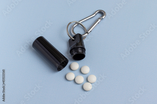 © Serhii, Naklejka premium Metal box for medicine and pills on blue background. Pill box connected with a carbine.