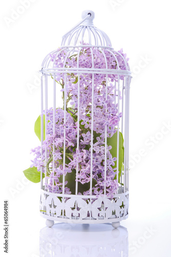Naklejka premium Metal cage with lilac flowers inside