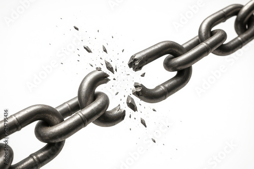 © Tanja, Obraz premium Metal chain breaking apart with fragments exploding on white background