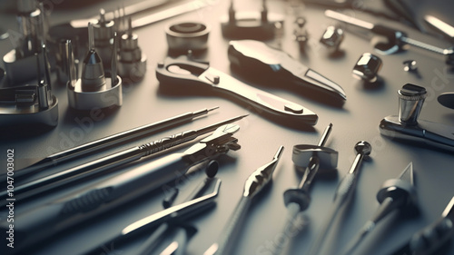 © AVADA, Fototapeta premium Metal cooking utensils on table Opened kitchen drawer with Stainless steel cutlery set
