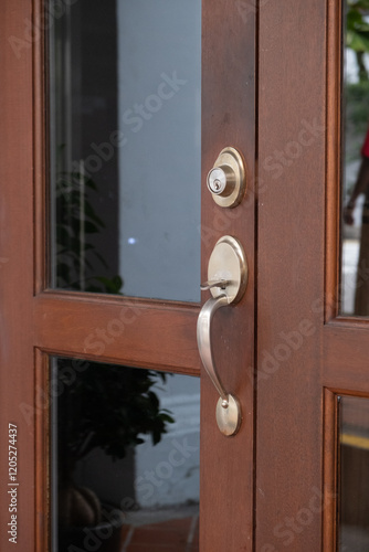© moomusician, Obraz premium Metal door handle with keyhole on wooden door