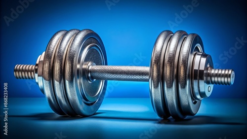 Naklejka premium Metal dumbbell with textured grip isolated on blue background, symbolizing...