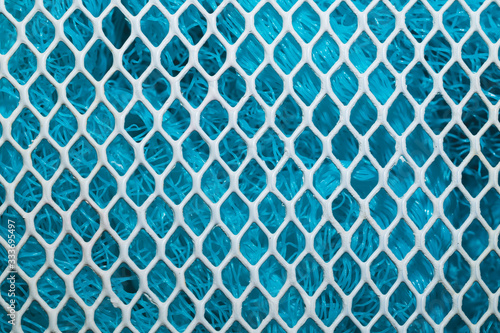 © maxkolmeto, Naklejka premium Metal enameled grid. abstract background. blue cloth behind the metallic grate