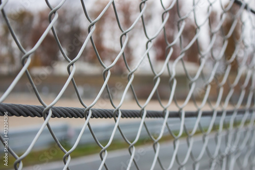 Fototapeta premium Metal fence close up. Security and safety concept. Metallic wire barrier....