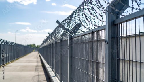 Fototapeta premium Metal fence with barbed wire extends along a pathway under a partly cloudy sky