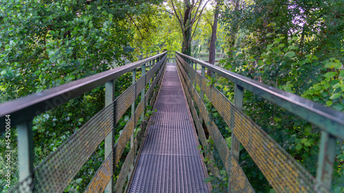 Fototapeta premium Metal footbridge crossing the river among the trees, close-up