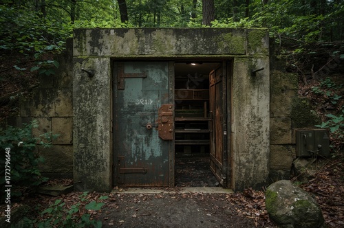© vxnaghiyev, Fototapeta premium Metal gateway to a vintage subterranean bunker