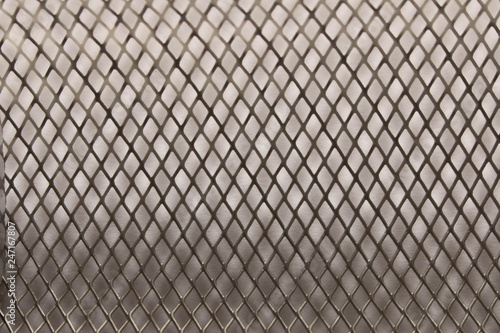 © Aliaksandr, Fototapeta premium Metal mesh background texture. On white background. Close up. Selective focus.