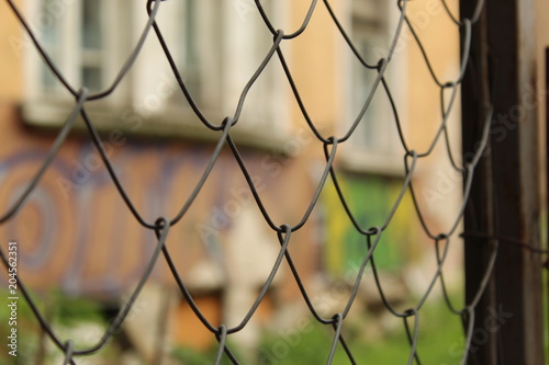 Fototapeta premium Metal Mesh Fence Fragment Foreground And Graffiti Wall Background City Sofia...