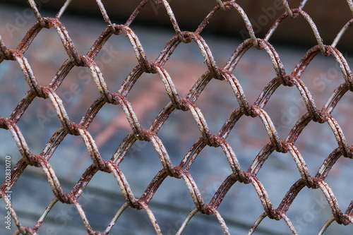© Iuliia, Fototapeta premium Metal rusty security fence on blurred background