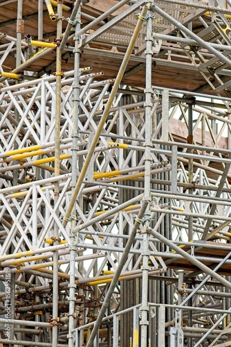© Nuria, Obraz premium Metal scaffolding forming a complex framework, providing support for ongoing construction work